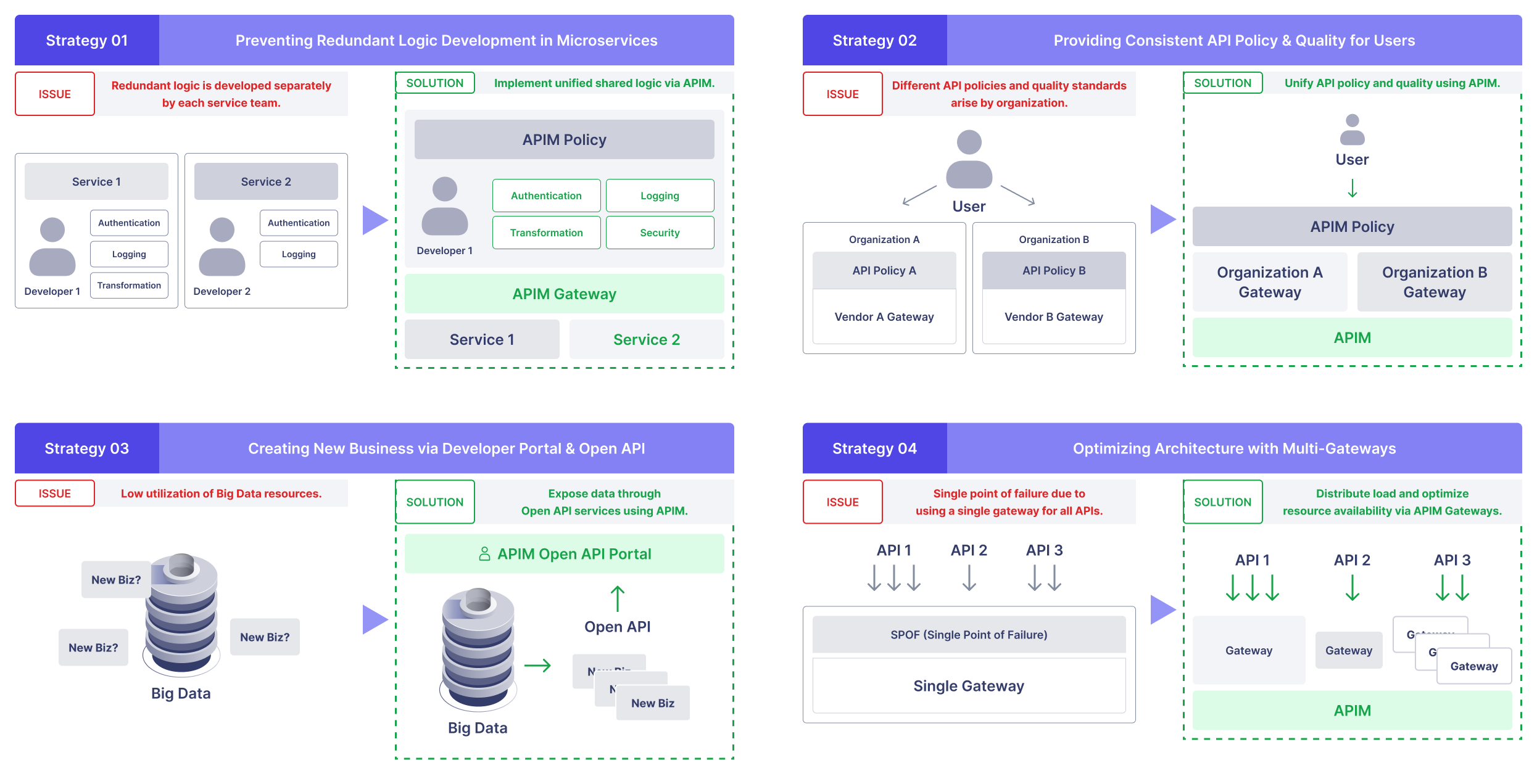 - 서비스 품질, 정책 집행 및 보안 기준이 팀 간에 달라 전체 API 신뢰성이 감소했습니다.