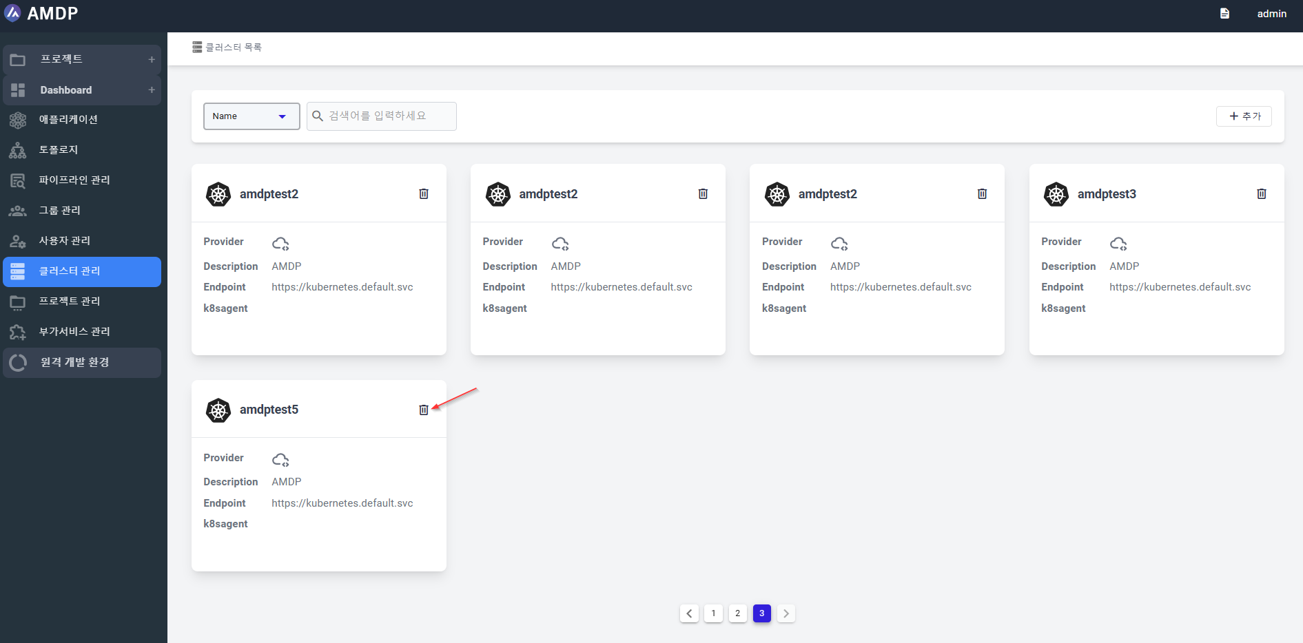 1. 要从列表中删除一个集群,选择“回收站”图标: